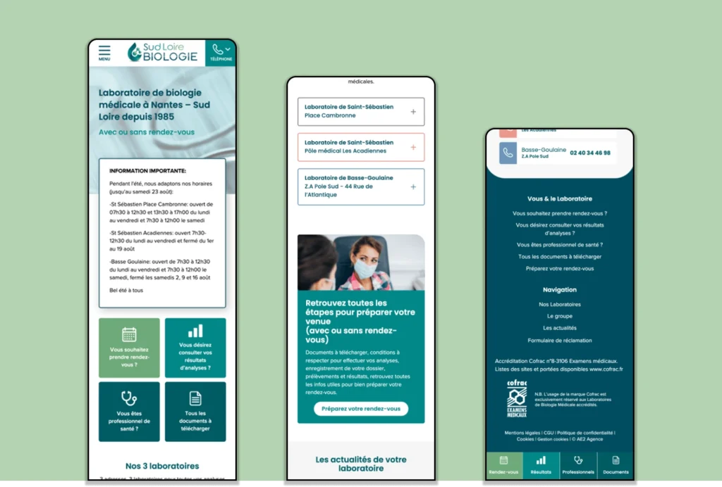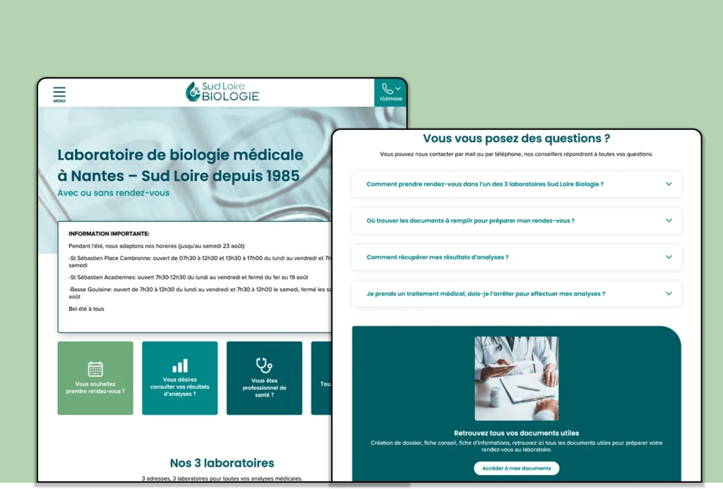Refonte du site vitrine de Sud Loire Biologie, un réseau de trois laboratoires d’analyses médicales, avec pour objectif de proposer une plateforme claire, accessible et orientée utilisateurs.